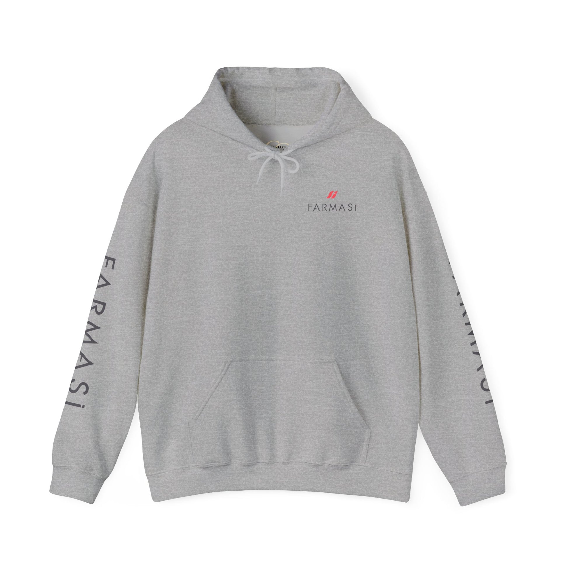 Farmasi Logo Hoodie — Branded Grey Pullover with Sleeve & Back Print