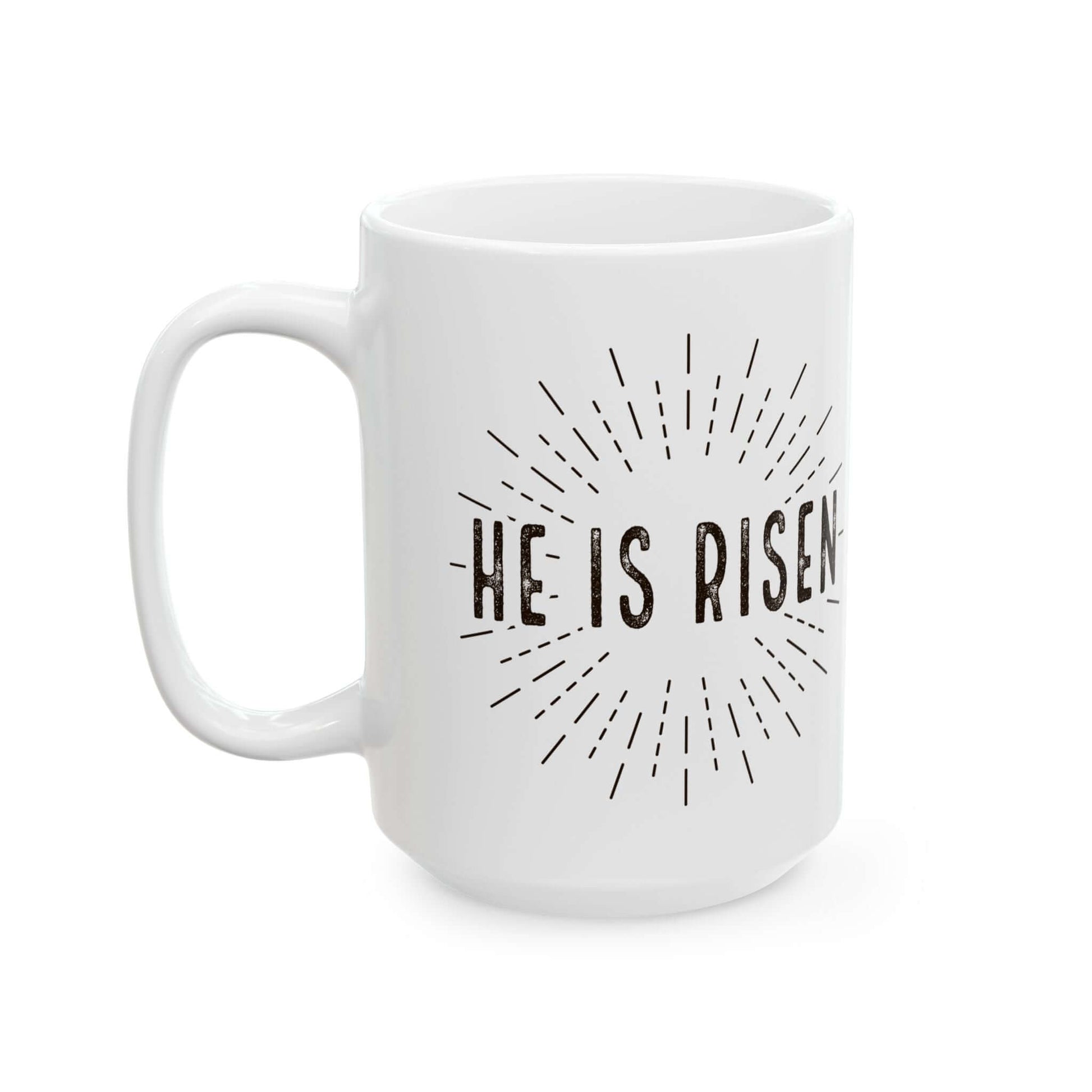 A ceramic mug with a glossy finish featuring the message 'He is Risen. This mug serves as a daily reminder of love and sacrifice, perfect for Easter celebrations and for those seeking daily spiritual inspiration.
